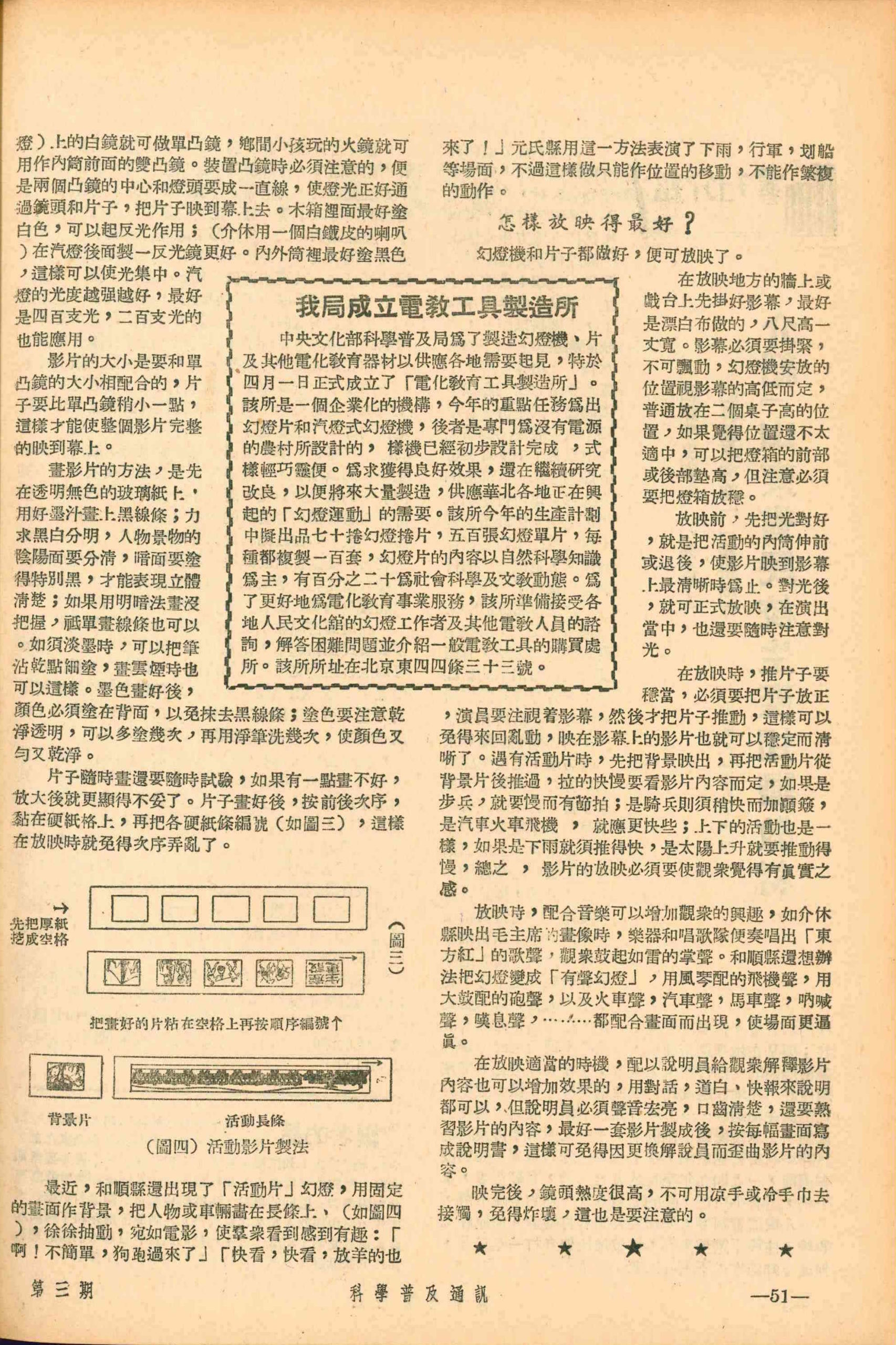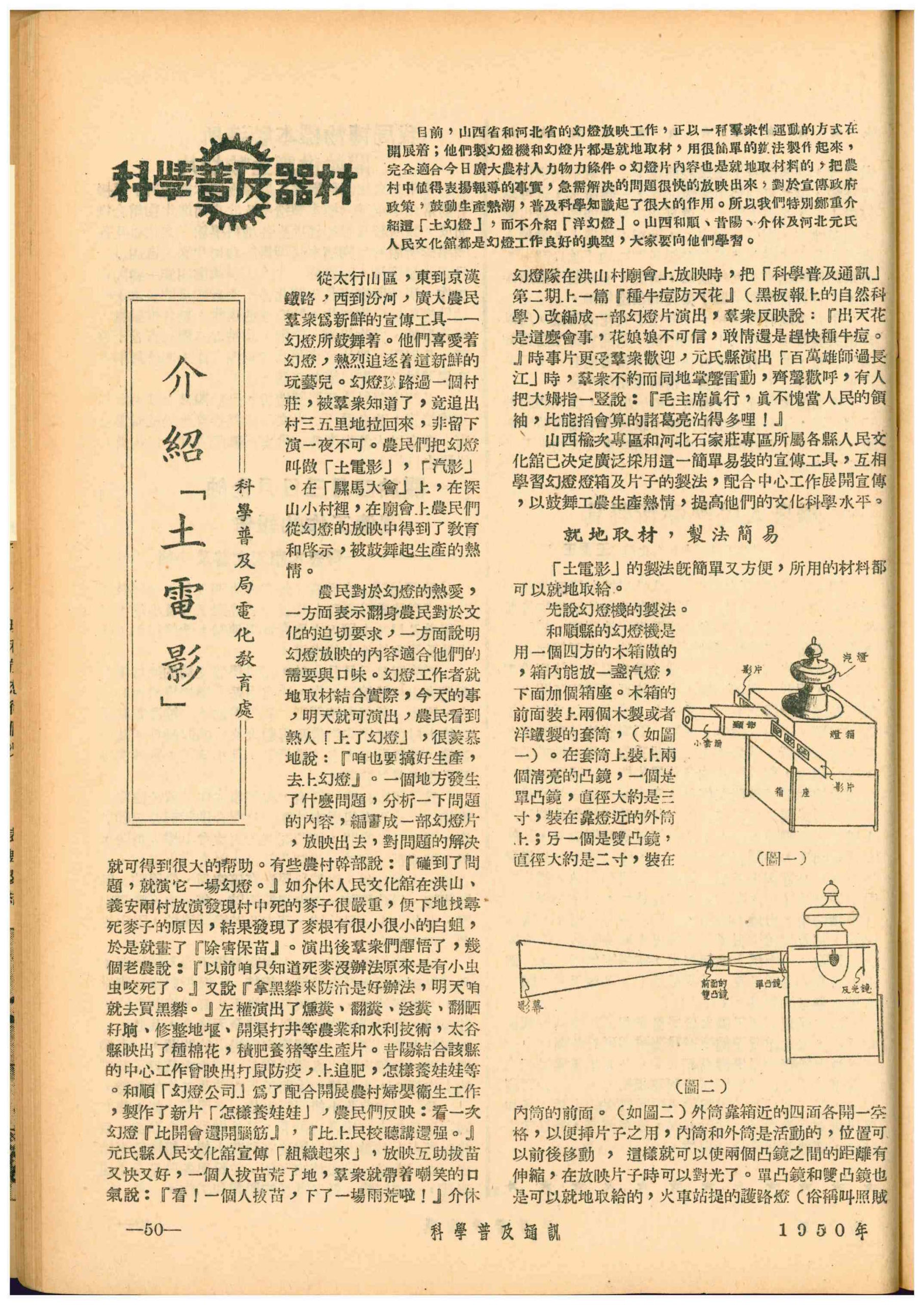 Projection teams were originally designed for maximizing the propaganda effect of socialist cinema on factories, mines, villages, and military camps — sections of society so far largeky underprivileged to the access of media entertainment. Later, it became the entity that mainly targeted rural audiences. Examinations of over-time newspaper reports and short memoires clearly reflect such a shift as well as the political functions that projection teams were expected to serve. From the mid-1950s, the films that project teams brought to the villages were intended for a range of essential social needs, including the peasants’ cultural life (人民的文化生活), gaining of new information (including scientific and pragmatic knowledge on agricultural production under the category of science education films 科学教育片), and the strengthening of socialist and patriotic values (社会主义、爱国主义教育). Movie projection activities were not only considered helpful for peasants to distinguish between good and evil (帮助农民辨明是非), but also deemed more effective than conventional ways of persuasion (因为电影的内容具体生动,比一般口头的宣传教育工作更富有说服力). Thus, workers of the projection teams were not only expected to be technically professional, but more importantly, politically sensitive and persuasive. Personnel training and team organization, therefore, were taken as a politically important task, and required cooperation and mobilization at a national level. The following text taken from the Newsletter of Science Dissemination (Kexue puji tongxun 科学普及通讯), the journal printed for issuing the official guidelines of science dissemination, discussing practical work, and exchanging experiences. In November 1949, shortly after the establishment of the PRC the Bureau of Science Dissemination under the leadership of the Ministry of Culture of the Central People’s Government (Zhongyang renmin zhengfu wenhuabu kexue pujiju 中央人民政府文化部科学普及局) was founded. After seven discussion meetings (zuotanhui 座谈会) between December 1949 and January 1950 it was recognized that science dissemination should be concerted efforts of cultural institutions, and this included the conscious use of movies shown by projectors. The document below shows how projectors functioned and how they should serve the purpose of disseminating scientific and political knowledge in the countryside.